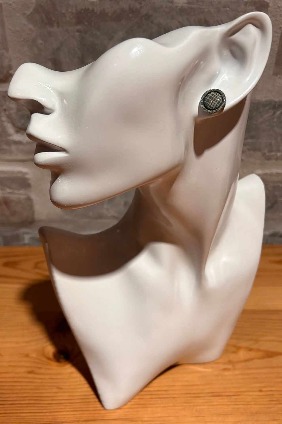 Dark teal circular stud with beige linen print